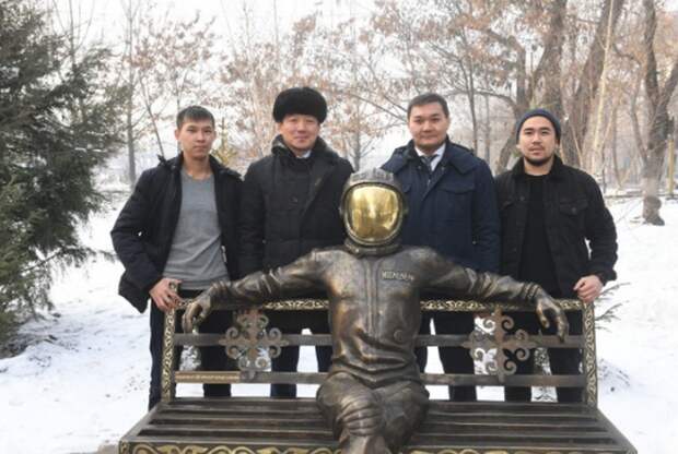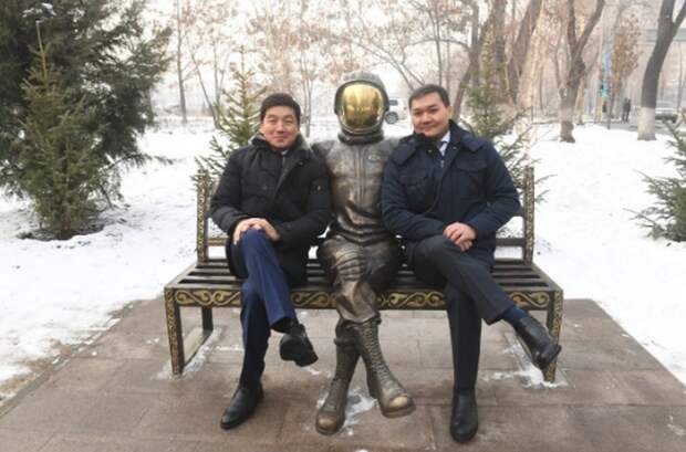 Инсталляция из бронзы Юрию Гагарину появилась в Алматы. Как-то подобную скульптуру заметил во дворе нового жилого комплекса аким города Бауыржан Байбек. Инсталляция понравилась руководству и было дано распоряжение установить подобную, но более проработанную скульптуру на проспекте Гагарина.