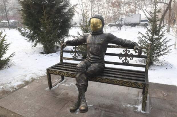 Теперь там на фирменной алматинской скамейке сидит фигура первого космонавта земли в скафандре.